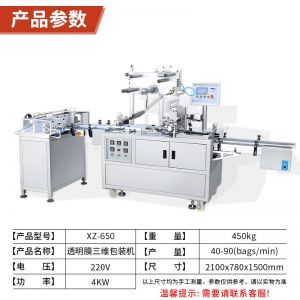 XZ-650包裝機,三維包裝機,全自動化操作出膜、切膜、包膜、熱封一次完成。可廣泛應用多種產品,適用包裝的產品有食品、撲克牌、香煙盒化妝品、日用品、文具用品等類型產品。
